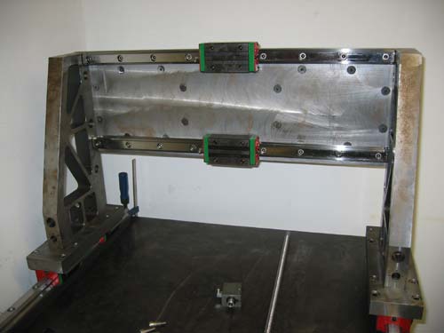 Für die Y Achse habe ich auch 30mm HIWIN Linearschienen genommen, allerdings mit nur einen Schwerlastwagen pro Seite. Diese können in etwa die gleichen Kräfte wie zwei normale Wagen aufnehmen. Um den Verfahrweg der Y Achse nicht durch zwei Wagen zu sehr einzuschränken, habe ich deshalb die Schwerlastwagen genommen.